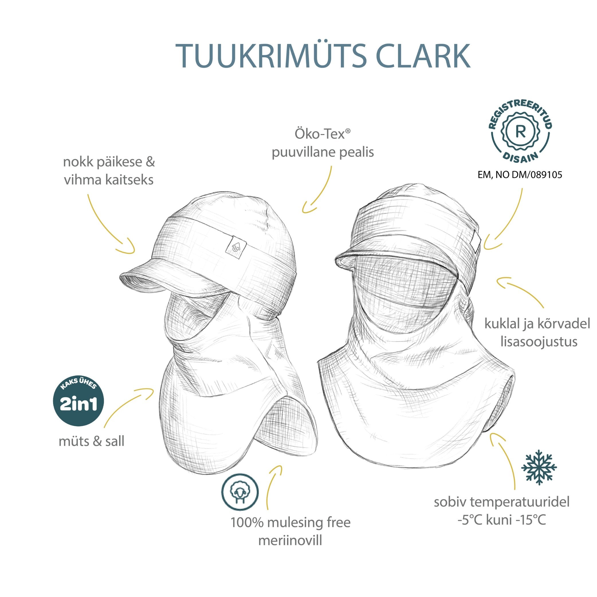 Talvise meriinovillase voodri ja nokaga CLARK on sademete ja päikesekiirte kaitseks kohandatud versioon Eesti esimesest omalaadsest müts-sallist. Clarki kõrvade ja kukla piirkond on varustatud topeltvoodriga, et pakkuda lapsele täiendavat kaitset tuule ja külma eest. Talviseks kasutamiseks mõeldud vooder reguleerib kehatemperatuuri ja juhib niiskuse nahapinnalt eemale. Salli pikendatud esi- ja tagaosa hoiavad lapse ringkere soojas ning seda on võimalik kanda lõua all või vajadusel tõmmata maskina näo peale. CLARKi vooder on valmistatud mulesing free meriinovillast. Rahvusvahelise kasuliku mudeli kaitsega EM, NO DM/089105.