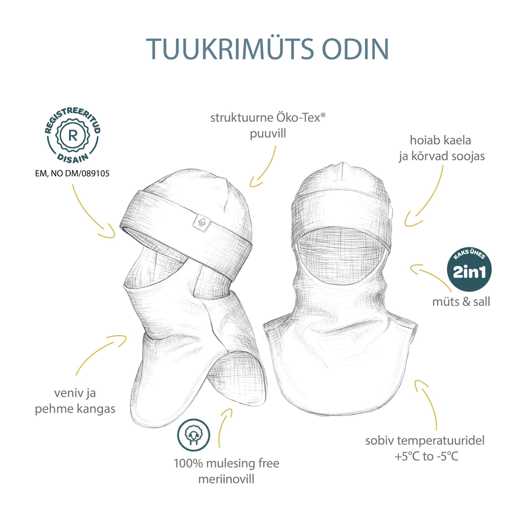 Sügis-talvisel tuukrimütsil ODIN on eriti põnev pealiskangas - reljeefse triibuga puuvill. Meriinovillane vooder reguleerib kehatemperatuuri ja juhib niiskuse nahapinnalt eemale. ODIN mudelil on tuukrimütsi praktilisus ja mütsi ja salli silmipaitav välimus ning salli pikendatud esi- ja tagaosa hoiavad lapse rindkere soojas ning seda on võimalik kanda lõua all või vajadusel tõmmata maskina näo peale. ODINi vooder on valmistatud mulesing free meriinovillast ning sellel on rahvusvahelise kasuliku mudeli kaitse EM, NO DM/089105.