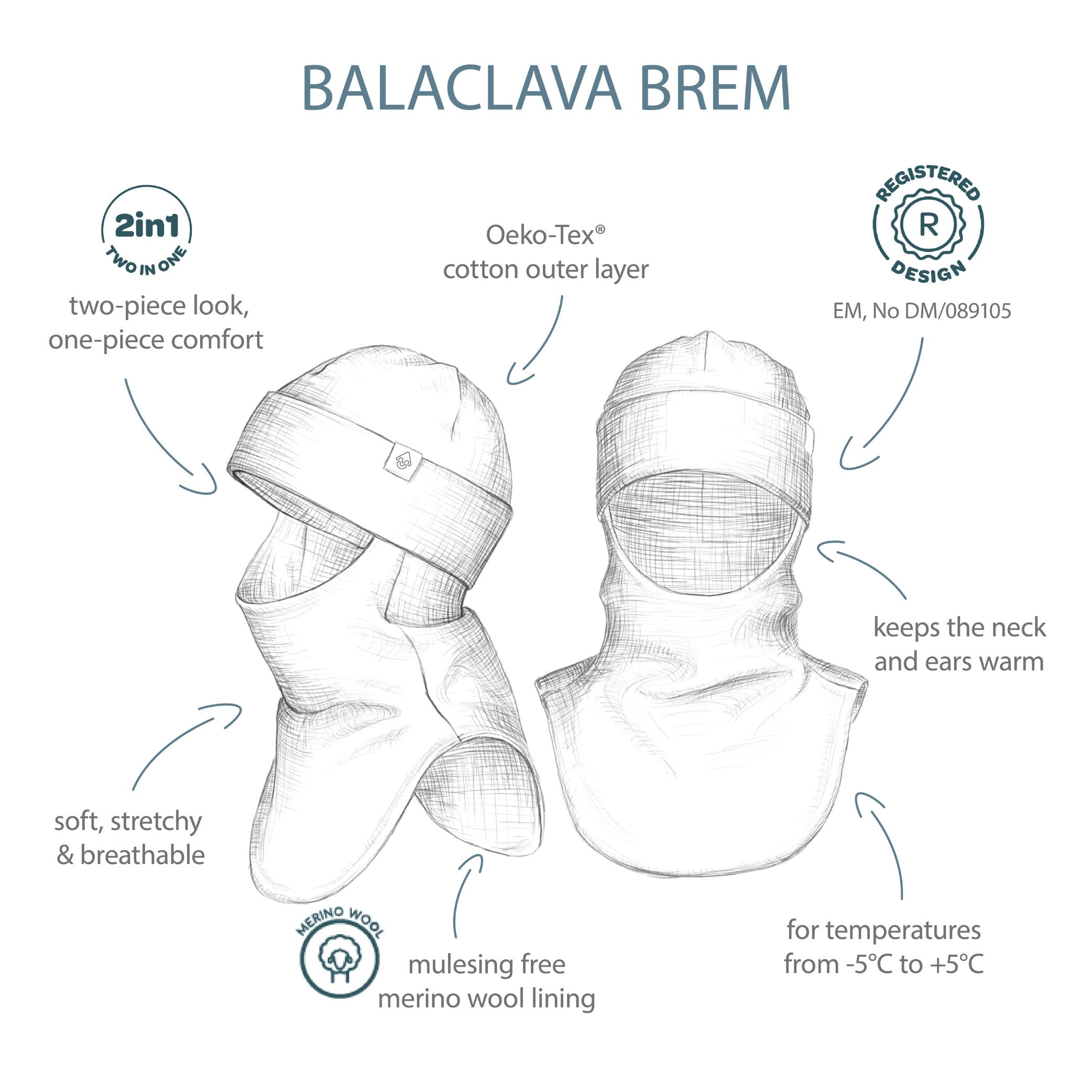Balaclava BREM is thoughtfully designed as our classic everyday merino option — offering natural warmth, softness and breathability in a simple, comfortable design without added bulk. It’s a reliable choice for children who benefit from merino wool’s temperature-regulating qualities during active play.